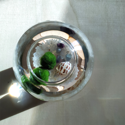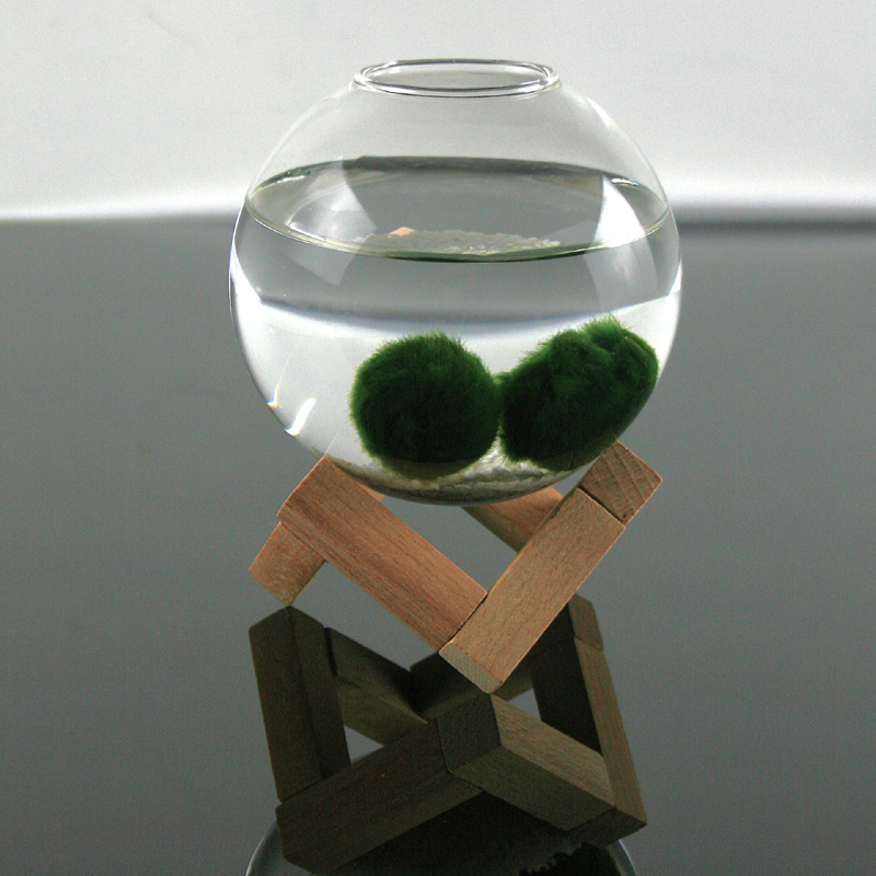 Uma peça decorativa única e contemporânea que alia natureza e design. Esta composição apresenta dois marimos vivos, colocados num pequeno e elegante aquário de vidro, realçando a simplicidade e a beleza natural destas esferas verdes. O conjunto é elevado por uma base geométrica em madeira, que acrescenta estabilidade e um contraste quente com o vidro e a água. O resultado é um elemento decorativo equilibrado e moderno, ideal para destacar em prateleiras, secretárias ou aparadores. Perfeito para quem procura uma decoração viva e original. O que inclui: - Aquário - 2 marimos - Areia clara - 1 Búzio Os marimos são organismos vivos, resistentes e de baixa manutenção. Apenas precisam de: - Luz indireta - Trocar a água semanalmente - Ambiente fresco Dimensões do Marimo: +/- 2 cm (diâmetro) Dimensões do frasco: 12,5 cm (altura com suporte de madeira) x 9 cm (diâmetro)