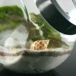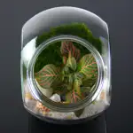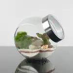 Boião grande com tampa transparente, onde é visível uma planta fitónia com areia decorativa e pedrinhas branca em fundo de musgo verde. Dimensões do frasco: 15 cm × 14 cm × 11cm Ideal para oferecer algo bonito e natural.